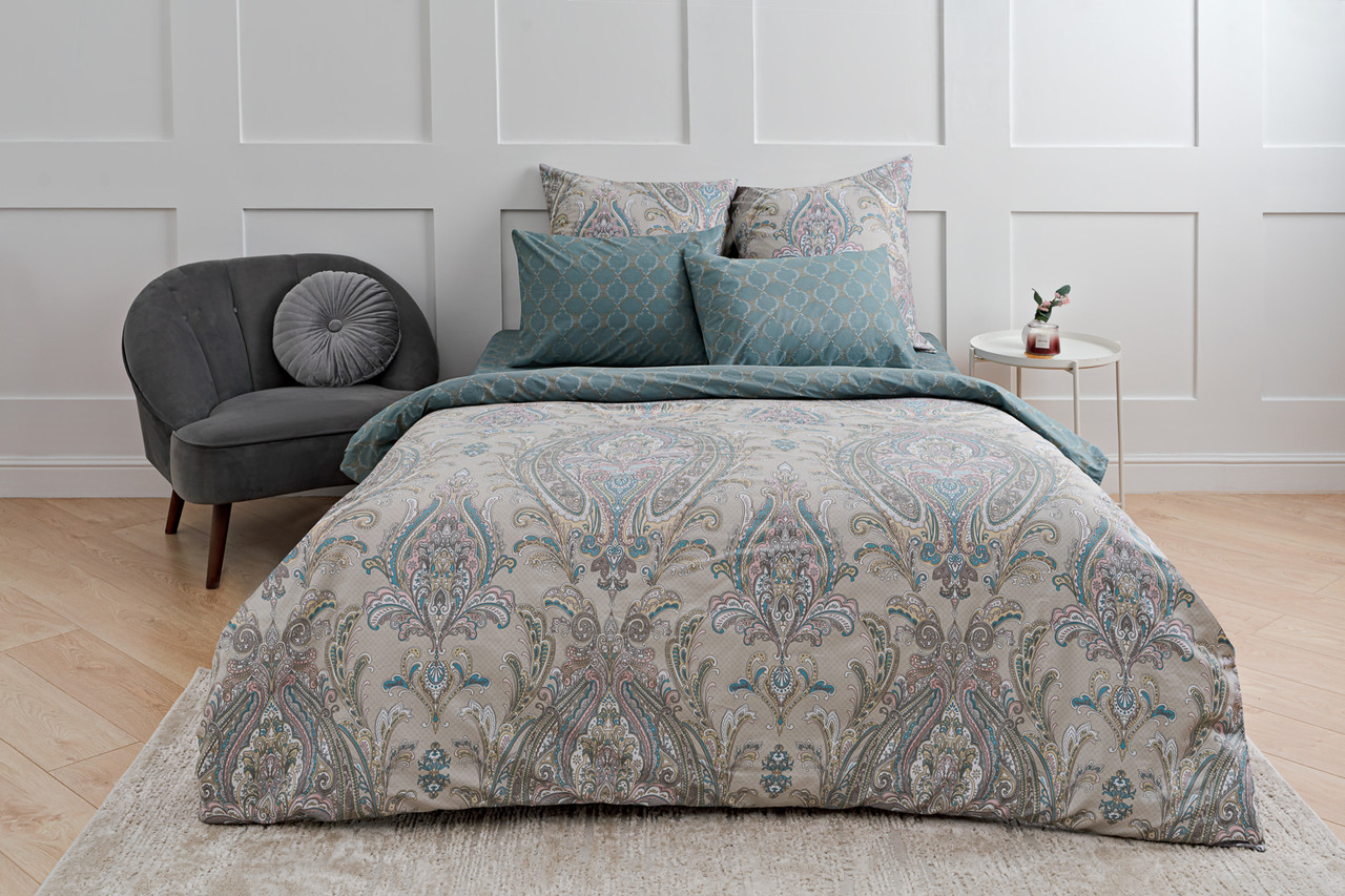 Постельное белье выполнено из сатина высокой плотности (пряжа 40х40) с пигментным окрашиванием. Ткань шелковистая, очень приятная на ощупь. Пододеяльник и наволочки сшиты из основной ткани, простынь и обратная сторона пододеяльника выполнены из ткани-компаньона. В пододеяльник вшита длинная молния.