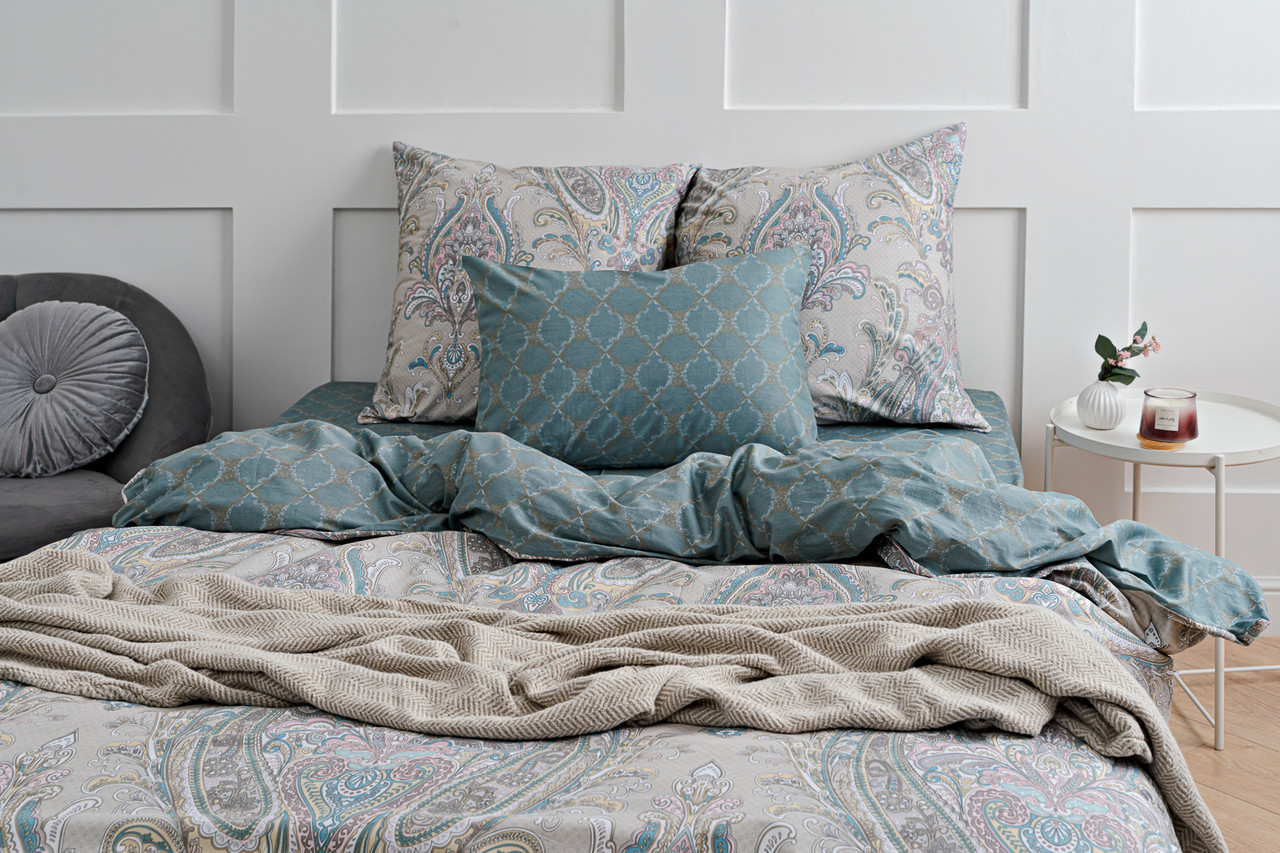 Постельное белье выполнено из сатина высокой плотности (пряжа 40х40) с пигментным окрашиванием. Ткань шелковистая, очень приятная на ощупь. Пододеяльник и наволочки сшиты из основной ткани, простынь и обратная сторона пододеяльника выполнены из ткани-компаньона. В пододеяльник вшита длинная молния.